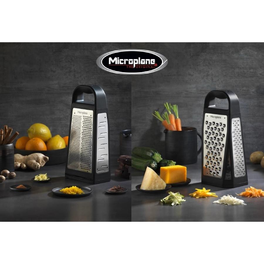 O Microplane® - Elite Box Ralador - Composto por 5 estilos de lâmina diferentes em um design clássico de quatro lados. Ferramenta de grade 5 em 1 que economiza espaço , cinco lâminas de aço inoxidável fabricadas nos EUA: Fino, Grosso, Ultra Grosso, Fita e Detalhes do produto de barbeador grande
